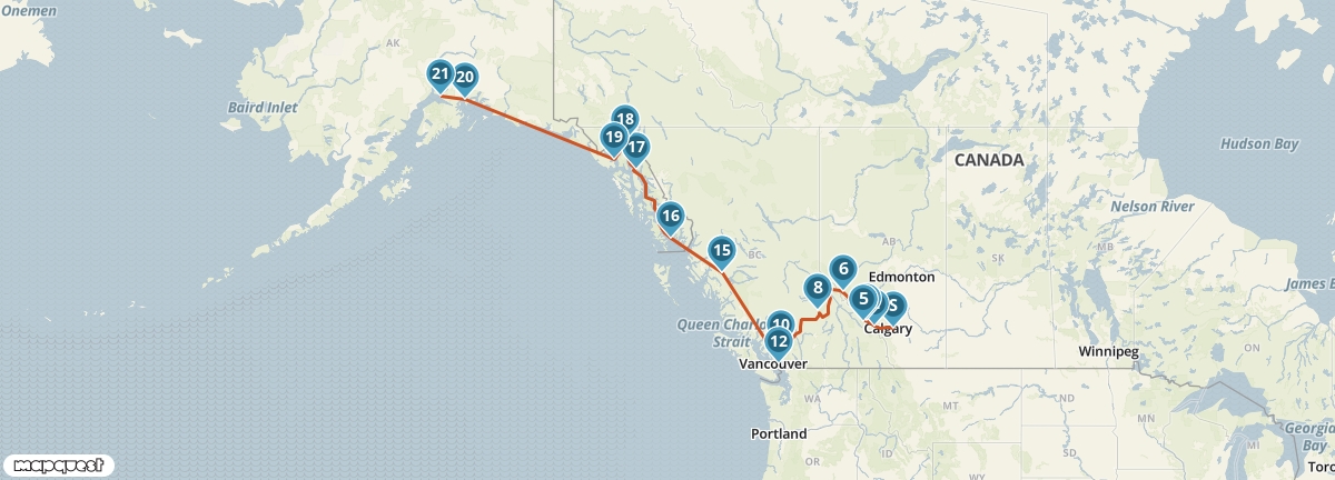 Dit traject bevat een ferry van Ketchikan naar Juneau.