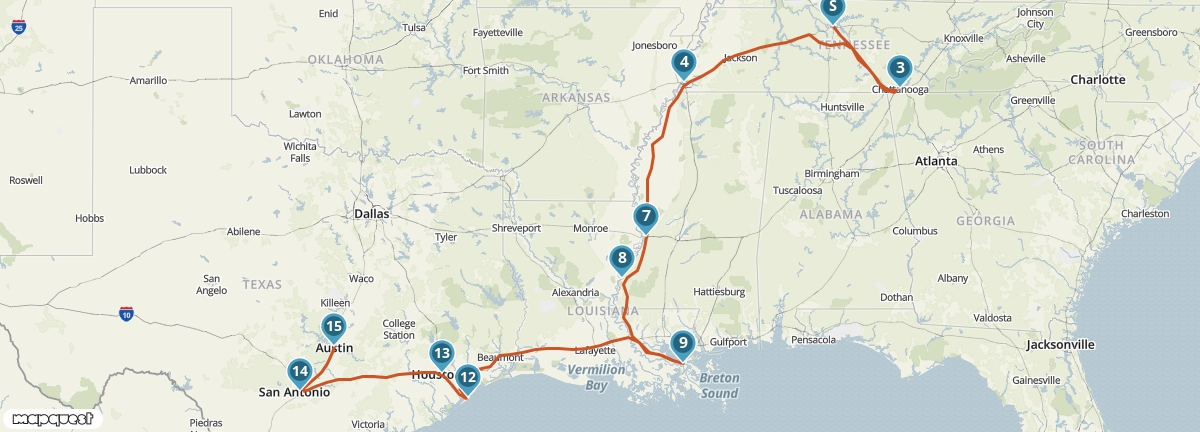 Deze autoreis door de Deep South is speciaal samengesteld voor liefhebbers van Amerikaanse muziek. De reis begint in Nashville, waar je kunt genieten van country- & westernmuziek. Daarna bezoek je Memphis, de stad van Martin Luther King en Elvis Presley. Voor jazz en soul bezoek je New Orleans en rock vind je in Austin, de hoofdstad van Texas en tevens eindbestemming van deze autoreis. Een complete kennismaking met het Diepe Zuiden!