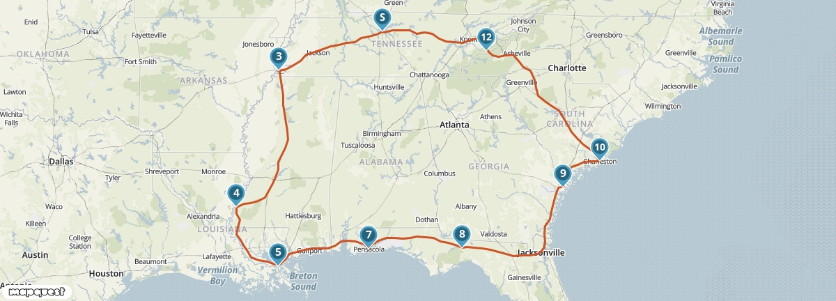 Tijdens deze reis bezoek je het ‘Diepe Zuiden’ en de twee Carolina’s. Je bezoekt de muzikale stad Nashville, de bakermat van de country- en westernmuziek, en Memphis, de stad van Elvis Presley en Martin Luther King. In de Great Smoky Mountains maak je kennis met de natuur en in Charleston en Savannah kom je in aanraking met de zuidelijke tradities.