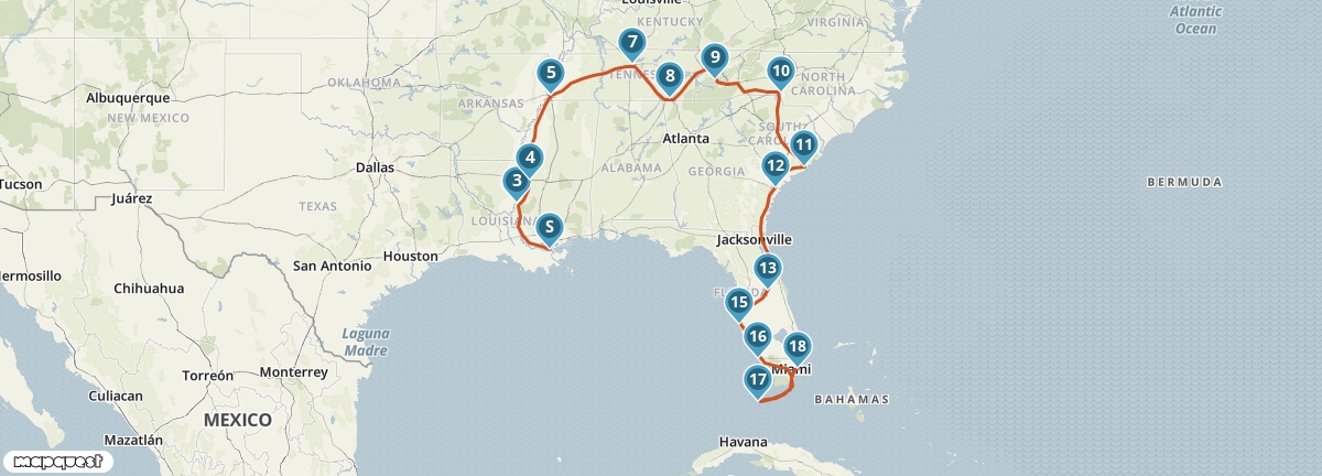 Een afwisselende autoreis door het 'Diepe Zuiden' van de Verenigde Staten. De hoogtepunten bestaan uit plantagehuizen, muzieksteden en strand. Je start in de multiculturele stad New Orleans en reist via Memphis en Nashville door de Appalachen naar antebellumsteden Charleston en Savannah, waar je plantages kunt bezoeken die kenmerkend zijn voor de Deep South. Tussendoor kun je genieten van de natuur en de rust van de Great Smoky Mountains. Je eindigt je autoreis aan de zonnige stranden van Florida.
