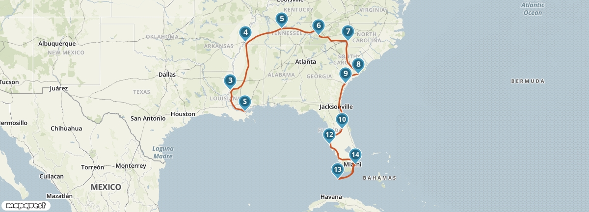 Een afwisselende autoreis door het 'Diepe Zuiden' van de Verenigde Staten. De hoogtepunten bestaan uit plantagehuizen, muzieksteden en strand. Je start in de multiculturele stad New Orleans en reist via Memphis en Nashville door de Appalachen naar antebellumsteden Charleston en Savannah, waar je plantages kunt bezoeken die kenmerkend zijn voor de Deep South. Tussendoor kun je genieten van de natuur en de rust van de Great Smoky Mountains. Je eindigt je autoreis aan de zonnige stranden van Florida.