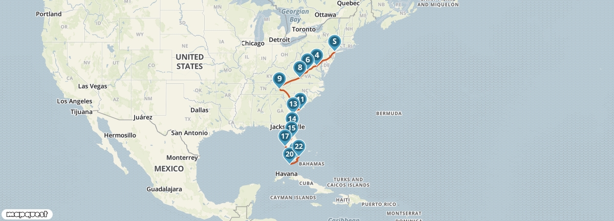 Een reis van New York langs de oostkust naar het Diepe Zuiden. Onderweg bezoek je veel plaatsen die een belangrijke rol speelden in de geschiedenis van de VS, waaronder Washington. Naarmate je verder naar het zuiden reist, maak je kennis met de natuur van Shenandoah, de Blue Ridge Mountains en de Great Smoky Mountains. Je reis eindigt in het zonnige Florida.