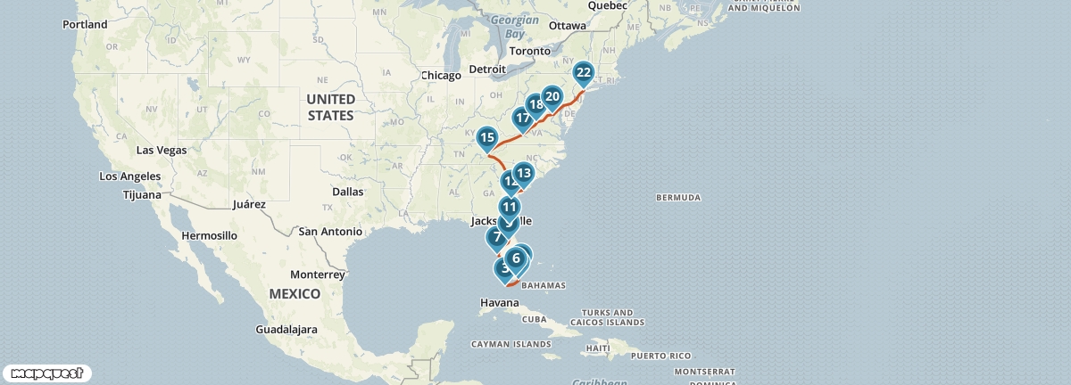 Een reis van het zonnige Florida, via het Diepe Zuiden naar New York. In het zuiden maak je kennis met de natuur van de Great Smoky Mountains, de Blue Ridge Mountains en Shenandoah. Verder naar het noorden bezoek je veel plaatsen die een belangrijke rol hebben gespeeld in de geschiedenis van de VS, waaronder Philadelphia en Washington.