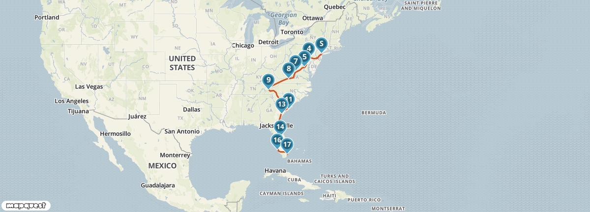 Een reis van New York langs de oostkust naar het Diepe Zuiden. Onderweg bezoek je veel plaatsen die een belangrijke rol speelden in de geschiedenis van de VS, waaronder Washington. Naarmate je verder naar het zuiden reist, maak je kennis met de natuur van Shenandoah, de Blue Ridge Mountains en de Great Smoky Mountains. Je reis eindigt in het zonnige Florida.