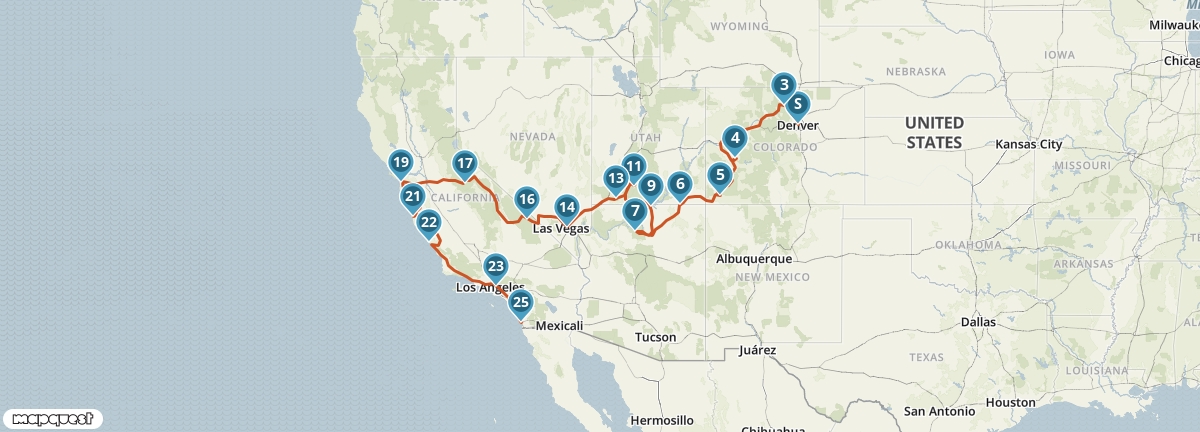 Volg het spoor van de pioniers en reis van Denver naar San Diego. Onderweg passeer je de Rocky Mountains, woestijngebieden, indianenreservaten en diverse National Parks, waaronder de Grand Canyon, Bryce Canyon, Death Valley en Yosemite. Het laatste stuk van de reis voert je langs de kust van de Grote Oceaan, met tussenstops in Monterey, San Simeon en Los Angeles.