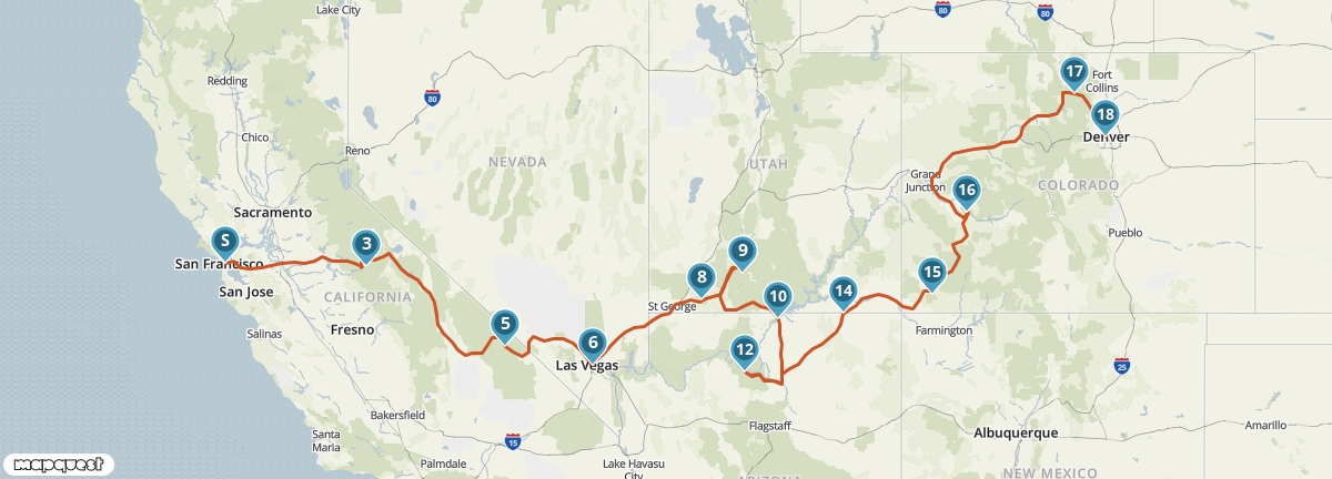 Treed in de voetsporen van de pioniers en reis van Denver naar San Francisco. Onderweg zul je je verbazen over de enorme verscheidenheid aan landschappen en de eindeloze vergezichten. Ontdek in de nationale parken Yosemite en Rocky Mountain de ongerepte natuur en neem in Mesa Verde National Park en Monument Valley een kijkje in het leven van indianen. Ook Las Vegas en de Grand Canyon ontbreken niet in deze reis.