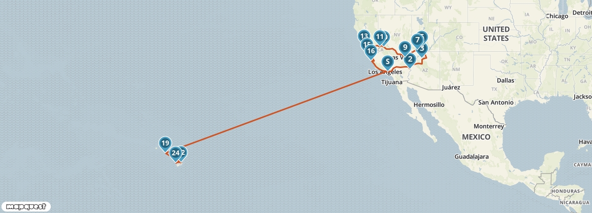 Het beste van Zuidwest-Amerika gecombineerd met de indrukwekkende natuur van Hawaii. Deze reis heeft het allemaal! Vanuit Los Angeles maak je een autorondreis langs de mooiste plaatsen van het zuidwesten van Amerika. Je bezoekt de Grand Canyon en Yosemite maar ook Las Vegas en San Francisco. De prachtige Pacific Coast Highway mag aan het einde van de route natuurlijk niet ontbreken. Vanuit Los Angeles vlieg je naar Honululu voor een bezoek aan Pearl Harbor en Wakiki Beach. Voor de zwarte vulkaanrotsen reizen we door naar Big Island. De laatste dagen is het tijd om heerlijk te ontspannen aan de westkust van dit eiland.
