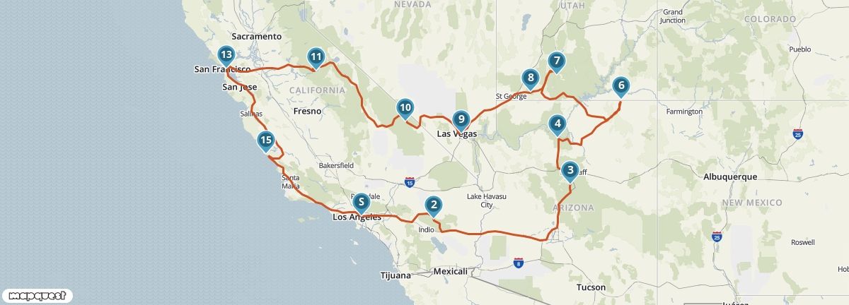 Vanuit Los Angeles maak je een rondreis langs de mooiste plaatsen van het zuidwesten van de Verenigde Staten. Je ziet de watervallen van Yosemite, de woestijnen van Nevada en Utah, de indianenreservaten van Arizona en de steden aan de Pacific Coast. Je verblijft op een aantal plaatsen twee nachten, dus je hebt voldoende tijd om alles goed te bekijken en te beleven.