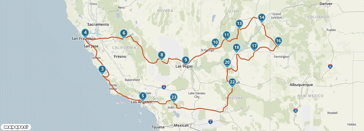 Vanuit Los Angeles maak je een rondreis langs de mooiste plaatsen van het zuidwesten van de Verenigde Staten. Je ziet de watervallen van Yosemite, de woestijnen van Nevada en Utah, de indianenreservaten van Arizona, Anasazi-nederzettingen in Colorado en de steden aan de Pacific Coast. Je verblijft op een aantal plaatsen twee nachten, dus je hebt voldoende tijd om alles goed te bekijken en te beleven.