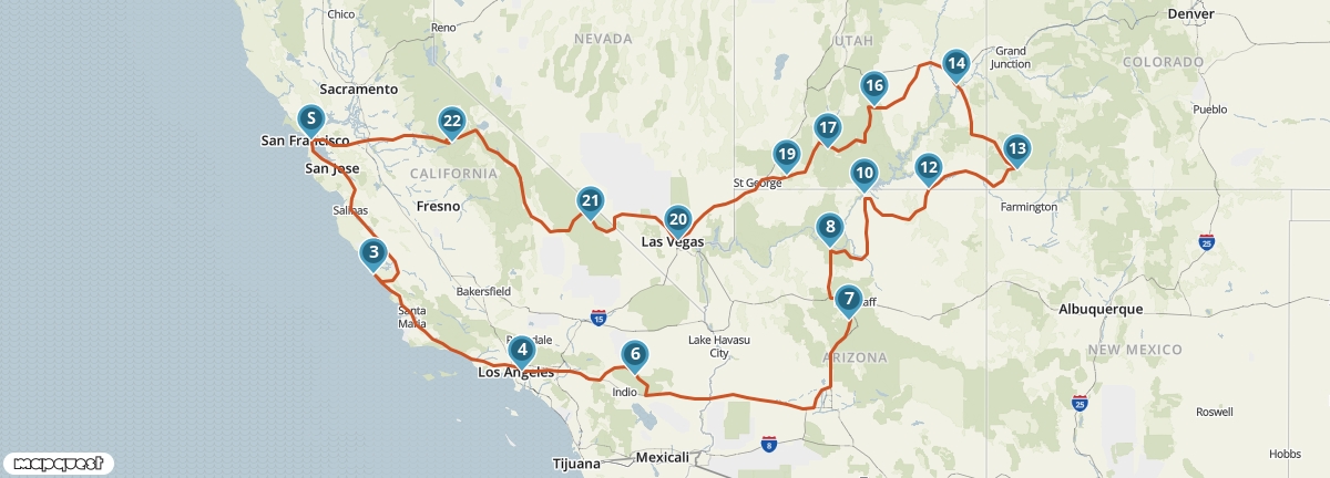 Vanuit San Francisco maak je een rondreis langs de mooiste plaatsen van het zuidwesten van de Verenigde Staten. Je ziet de watervallen van Yosemite, de woestijnen van Nevada en Utah, de indianenreservaten van Arizona, Anasazi-nederzettingen in Colorado en de steden aan de Pacific Coast. Je verblijft op een aantal plaatsen twee nachten, dus je hebt voldoende tijd om alles goed te bekijken en te beleven.