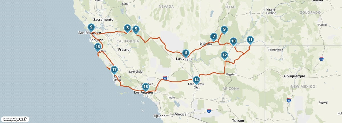 Vanuit San Francisco maak je een rondreis langs de mooiste plaatsen van het zuidwesten van de Verenigde Staten. Je ziet de watervallen van Yosemite, de woestijnen van Nevada en Utah, de indianenreservaten van Arizona en de steden aan de Pacific Coast. Je verblijft op een aantal plaatsen twee nachten, dus je hebt voldoende tijd om alles goed te bekijken en te beleven.