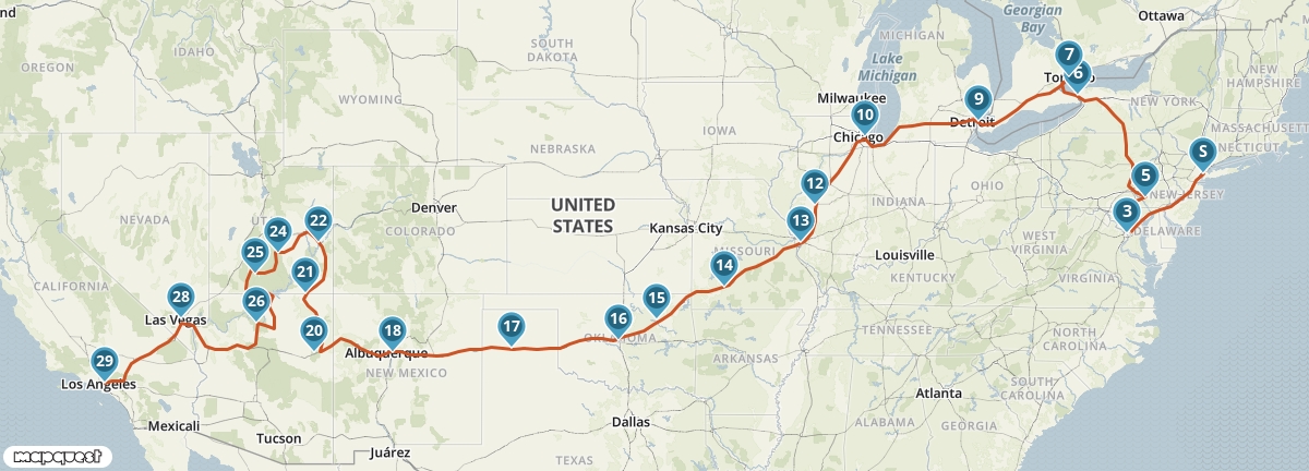Voor velen is dit een langgekoesterde wens: van de ene naar de andere kust, dwars over het Amerikaanse continent rijden. Van New York rijd je via de Niagara Falls naar Chicago, waarna je de legendarische Route 66 naar in westelijke richting volgt. Onderweg passeer je de eindeloze leegte van het Middenwesten en bezoek je diverse National Parks. De reis eindigt aan de Pacific Coast in Los Angeles.