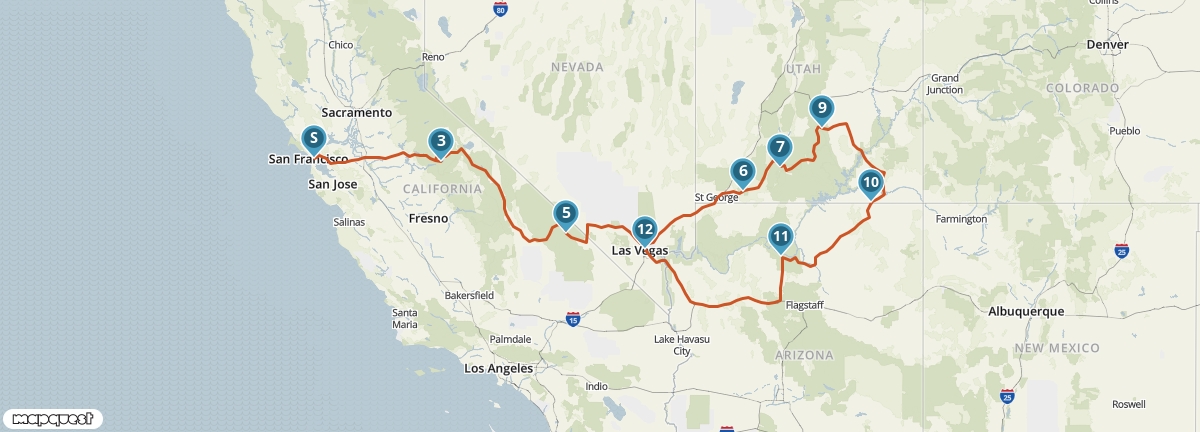 Een one-way met San Francisco als vertrekpunt en Las Vegas als eindpunt. Je rijdt landinwaarts via Yosemite National Park richting Nevada en bezoekt enkele bekende en minder bekende National Parks en indianenreservaten. Een van de hoogtepunten is de Grand Canyon.