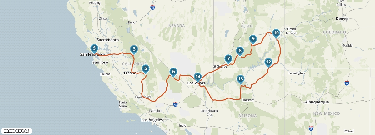 Een one-way met San Francisco als vertrekpunt en Las Vegas als eindpunt. Je rijdt landinwaarts via Yosemite National Park richting Nevada en bezoekt enkele bekende en minder bekende National Parks en indianenreservaten. Een van de hoogtepunten is de Grand Canyon.
