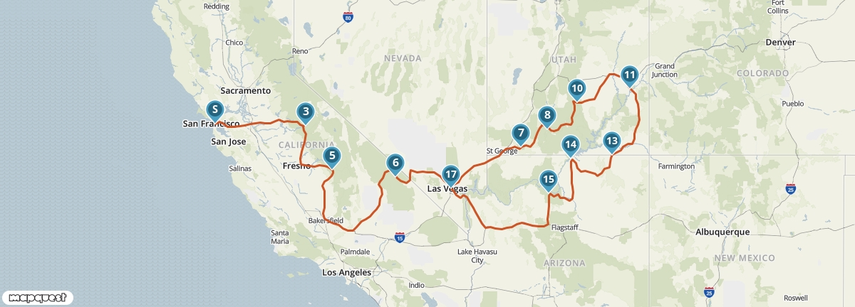 Een one-way met San Francisco als vertrekpunt en Las Vegas als eindpunt. Je rijdt landinwaarts via Yosemite National Park richting Nevada en bezoekt enkele bekende en minder bekende National Parks en indianenreservaten. Een van de hoogtepunten is de Grand Canyon.
