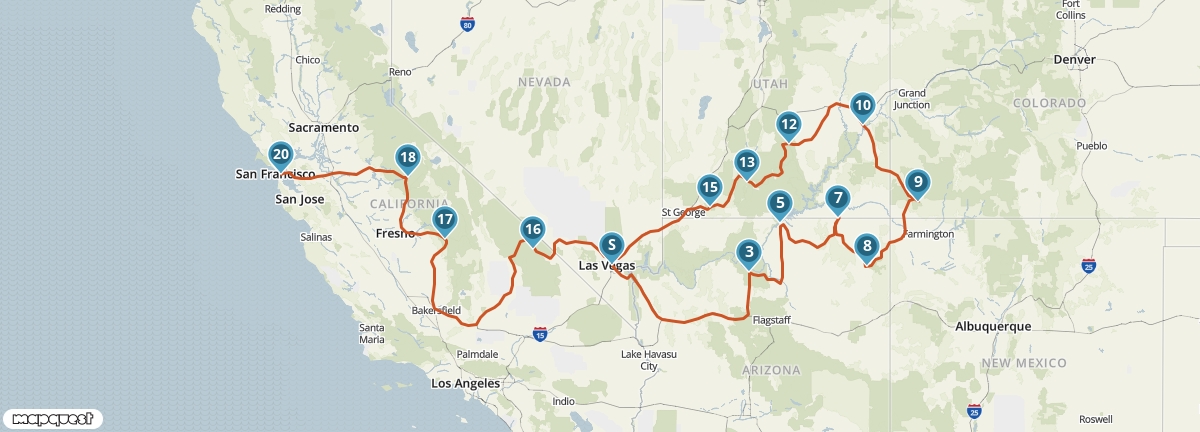 Een one-way met Las Vegas als vertrekpunt en San Francisco als eindpunt. Je bezoekt in Arizona onder andere de Grand Canyon en rijdt na enkele stops in Utah via Nevada naar de kust van Californië. Onderweg bezoek je indianenreservaten, een aantal bekende en minder bekende National Parks en de stad San Francisco.