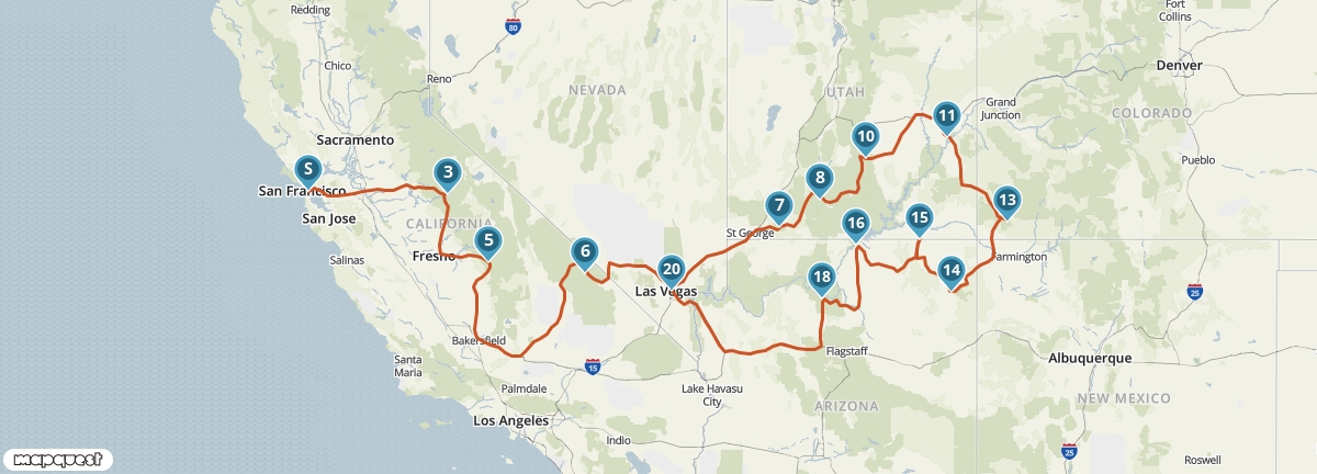 Een one-way met San Francisco als vertrekpunt en Las Vegas als eindpunt. Je rijdt landinwaarts via Yosemite National Park richting Nevada en bezoekt enkele bekende en minder bekende National Parks en indianenreservaten. Een van de hoogtepunten is de Grand Canyon.