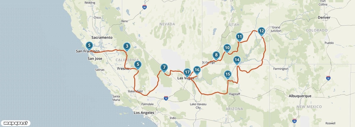 Een one-way route met San Francisco als vertrekpunt en Las Vegas als eindpunt, hiermee benut je de reistijd optimaal. De route brengt je door het groene Yosemite National Park, laat je kleurrijke rotsformaties zien met prachtige canyons. Verwonder je in de Grand Canyon, maak een spectaculaire wandeling door Zion National Park en stap op de fiets om San Francisco te ontdekken.