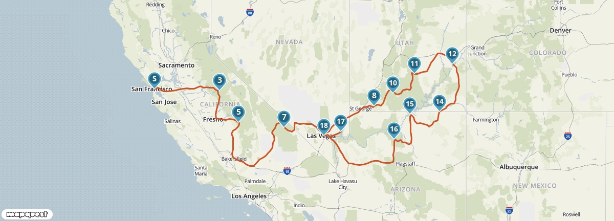 Een one-way route met San Francisco als vertrekpunt en Las Vegas als eindpunt, hiermee benut je de reistijd optimaal. De route brengt je door het groene Yosemite National Park, laat je kleurrijke rotsformaties zien met prachtige canyons. Verwonder je in de Grand Canyon, maak een spectaculaire wandeling door Zion National Park en stap op de fiets om San Francisco te ontdekken.