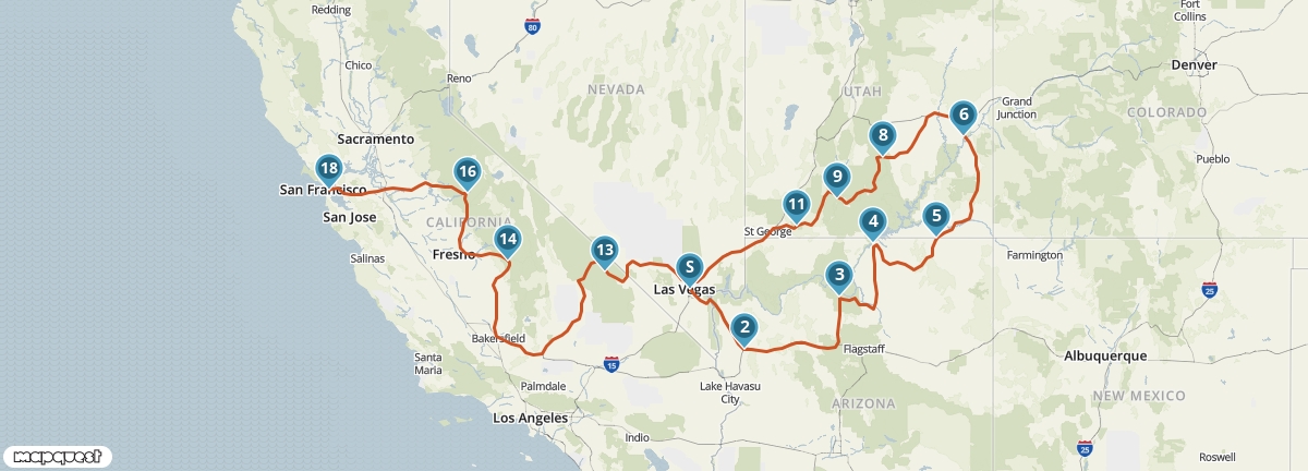 Een one-way route met Las Vegas als vertrekpunt en San Francisco als eindpunt, hiermee benut je de reistijd optimaal. Je bezoekt in Arizona onder andere de Grand Canyon en rijdt na enkele stops in de spectaculaire natuurparken van Utah naar de Sierra Nevada in Californië. Onderweg kan je canyons bezoeken, kleurrijke rotsformaties zien en brengt de route je door het groene Yosemite National Park.