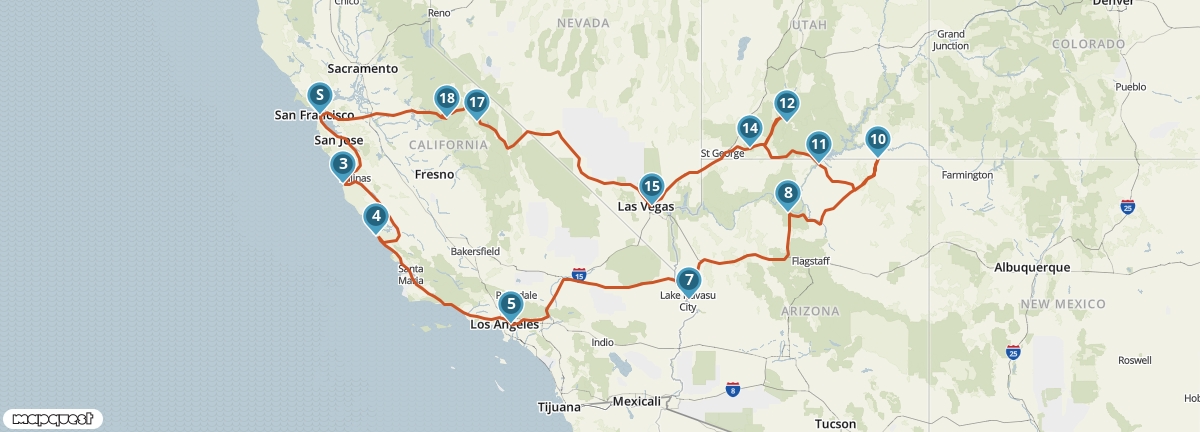 Tijdens deze reis krijg je een goede indruk van de hoogtepunten van het zuidwesten van de Verenigde Staten. Je bezoekt vier staten en ziet onderweg wereldsteden als San Francisco, Las Vegas en Los Angeles. Bovendien maak je kennis met verschillende National Parks, waaronder Yosemite en de Grand Canyon. Een van de mooiste etappes van de reis voert je over de beroemde Pacific Coast Highway.