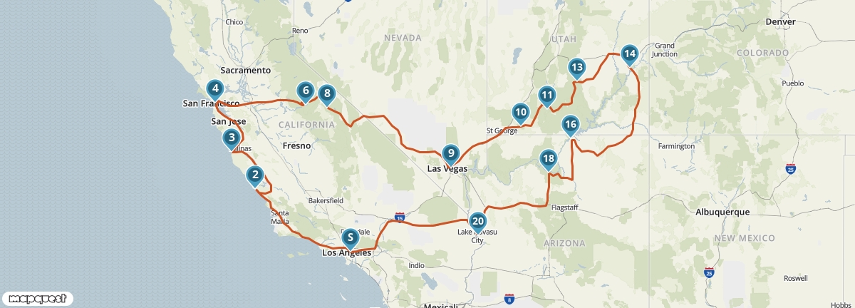 Tijdens deze reis krijg je een goede indruk van de hoogtepunten van het zuidwesten van de Verenigde Staten. Je bezoekt vier staten en ziet onderweg wereldsteden als San Francisco, Las Vegas en Los Angeles. Bovendien maak je kennis met verschillende National Parks, waaronder Yosemite en de Grand Canyon. Een van de mooiste etappes van de reis voert je over de beroemde Pacific Coast Highway.