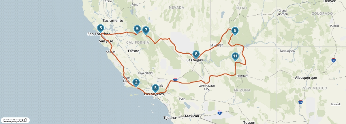 Tijdens deze reis krijg je een goede indruk van de hoogtepunten van het zuidwesten van de Verenigde Staten. Je bezoekt vier staten en ziet onderweg wereldsteden als San Francisco, Las Vegas en Los Angeles. Bovendien maak je kennis met verschillende National Parks, waaronder Yosemite en de Grand Canyon. Een van de mooiste etappes van de reis voert je over de beroemde Pacific Coast Highway.