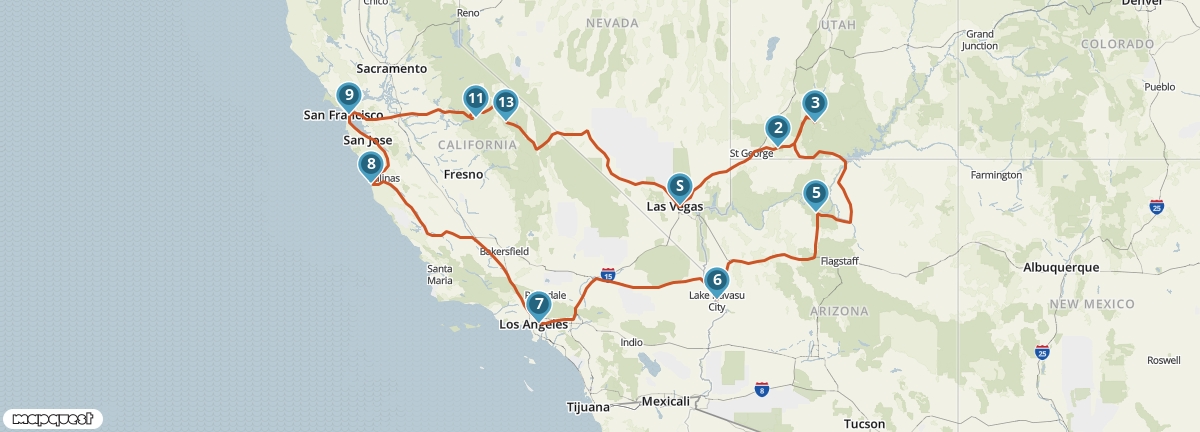 Tijdens deze reis krijg je een goede indruk van de hoogtepunten van het zuidwesten van de Verenigde Staten. Je bezoekt vier staten en ziet onderweg wereldsteden als San Francisco, Las Vegas en Los Angeles. Bovendien maak je kennis met verschillende National Parks, waaronder Yosemite en de Grand Canyon. Een van de mooiste etappes van de reis voert je over de beroemde Pacific Coast Highway.