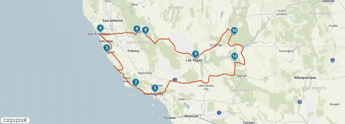 Tijdens deze reis krijg je een goede indruk van de hoogtepunten van het zuidwesten van de Verenigde Staten. Je bezoekt vier staten en ziet onderweg wereldsteden als San Francisco, Las Vegas en Los Angeles. Bovendien maak je kennis met verschillende National Parks, waaronder Yosemite en de Grand Canyon. Een van de mooiste etappes van de reis voert je over de beroemde Pacific Coast Highway.