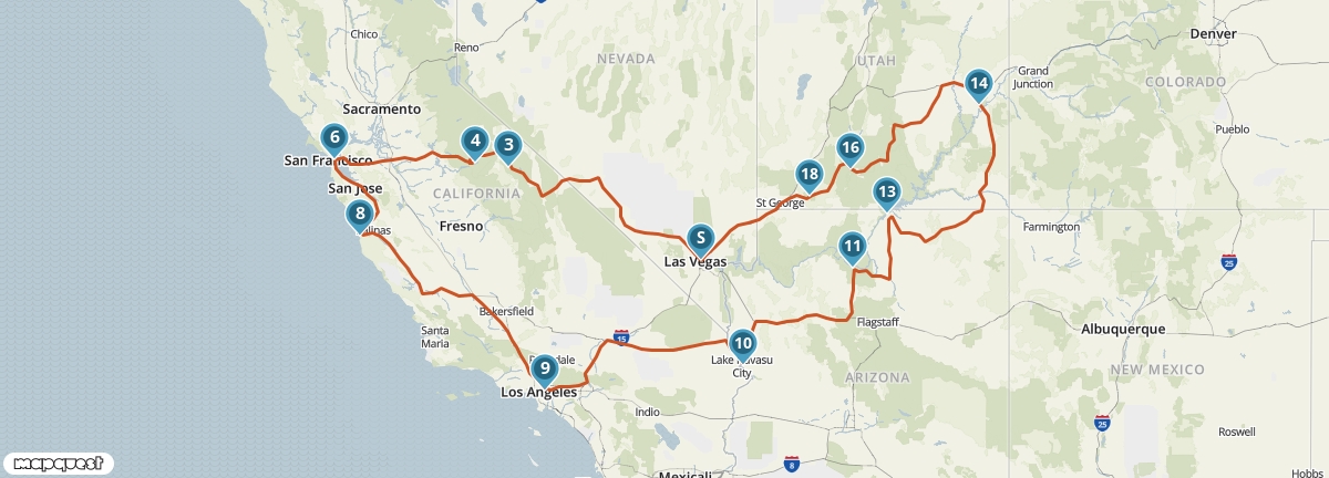 Tijdens deze reis krijg je een goede indruk van de hoogtepunten van het zuidwesten van de Verenigde Staten. Je bezoekt vier staten en ziet onderweg wereldsteden als San Francisco, Las Vegas en Los Angeles. Bovendien maak je kennis met verschillende National Parks, waaronder Yosemite en de Grand Canyon. Een van de mooiste etappes van de reis voert je over de beroemde Pacific Coast Highway.