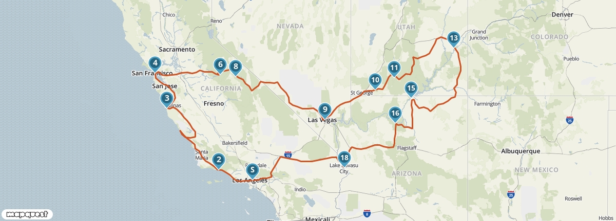 Tijdens deze reis krijg je een goede indruk van de hoogtepunten van het zuidwesten van de Verenigde Staten. Je bezoekt vier staten en ziet onderweg wereldsteden als San Francisco, Las Vegas en Los Angeles. Bovendien maak je kennis met verschillende National Parks, waaronder Yosemite en de Grand Canyon. Een van de mooiste etappes van de reis voert je over de beroemde Pacific Coast Highway.
