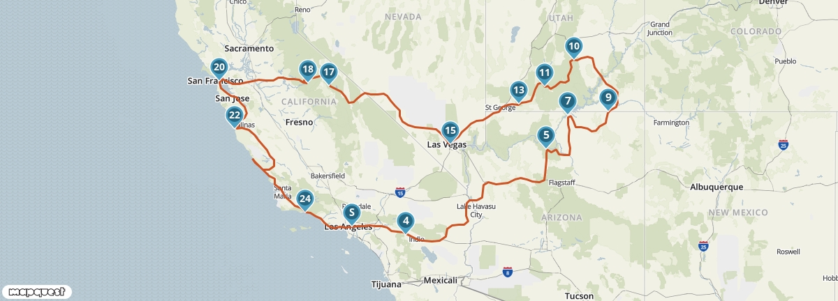 Tijdens deze camperreis door Zuidwest-Amerika krijg je een goede indruk van de hoogtepunten van dit deel van de Verenigde Staten. Je bezoekt vier staten en ziet onderweg wereldsteden als San Francisco, Las Vegas en Los Angeles. Bovendien maak je kennis met verschillende National Parks, waaronder Yosemite National Park en de Grand Canyon. Een van de mooiste etappes van de camperrondreis voert je over de beroemde Pacific Coast Highway.
