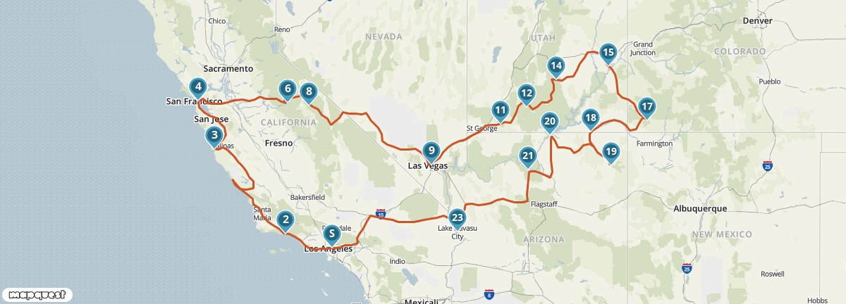 Tijdens deze reis krijg je een goede indruk van de hoogtepunten van het zuidwesten van de Verenigde Staten. Je bezoekt vier staten en ziet onderweg wereldsteden als San Francisco, Las Vegas en Los Angeles. Bovendien maak je kennis met verschillende National Parks, waaronder Yosemite en de Grand Canyon. Een van de mooiste etappes van de reis voert je over de beroemde Pacific Coast Highway.