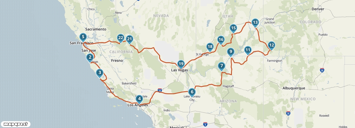 Tijdens deze reis krijg je een goede indruk van de hoogtepunten van het zuidwesten van de Verenigde Staten. Je bezoekt vier staten en ziet onderweg wereldsteden als San Francisco, Las Vegas en Los Angeles. Bovendien maak je kennis met verschillende National Parks, waaronder Yosemite en de Grand Canyon. Een van de mooiste etappes van de reis voert je over de beroemde Pacific Coast Highway.
