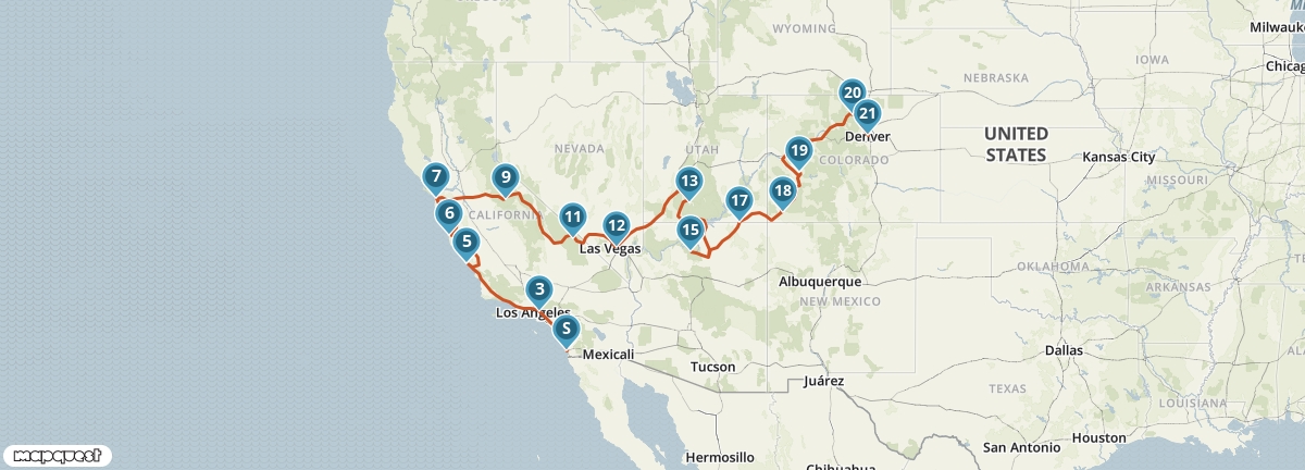 Volg het spoor van de pioniers en reis van San Diego naar Denver. Het eerste stuk van de reis voert je langs de kust van de Grote Oceaan, met tussenstops in Los Angeles, San Simeon en San Francisco. Via Yosemite National Park rijd je landinwaarts en passeer je woestijngebieden, indianenreservaten en diverse National Parks waaronder Zion, Bryce Canyon en Grand Canyon. Tenslotte steek je de Rocky Mountains over.