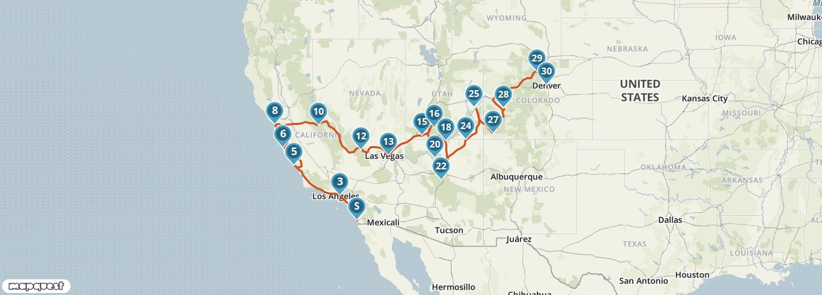 Volg het spoor van de pioniers en reis van San Diego naar Denver. Het eerste stuk van de reis voert je langs de kust van de Grote Oceaan, met tussenstops in Los Angeles, San Simeon en San Francisco. Via Yosemite National Park rijd je landinwaarts en passeer je woestijngebieden, indianenreservaten en diverse National Parks waaronder Zion, Bryce Canyon en Grand Canyon. Tenslotte steek je de Rocky Mountains over.