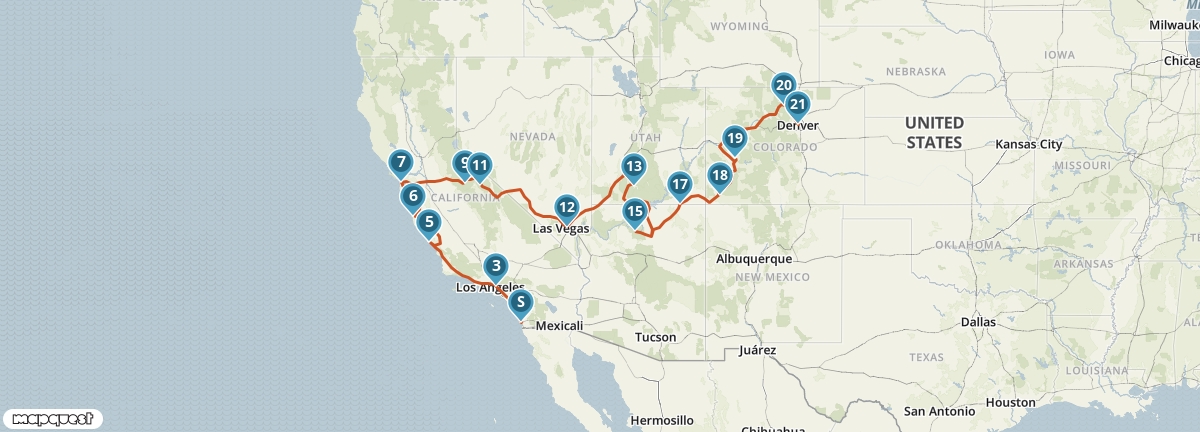 Volg het spoor van de pioniers en reis van San Diego naar Denver. Het eerste stuk van de reis voert je langs de kust van de Grote Oceaan, met tussenstops in Los Angeles, San Simeon en San Francisco. Via Yosemite National Park rijd je landinwaarts en passeer je woestijngebieden, indianenreservaten en diverse National Parks waaronder Zion, Bryce Canyon en Grand Canyon. Tenslotte steek je de Rocky Mountains over.