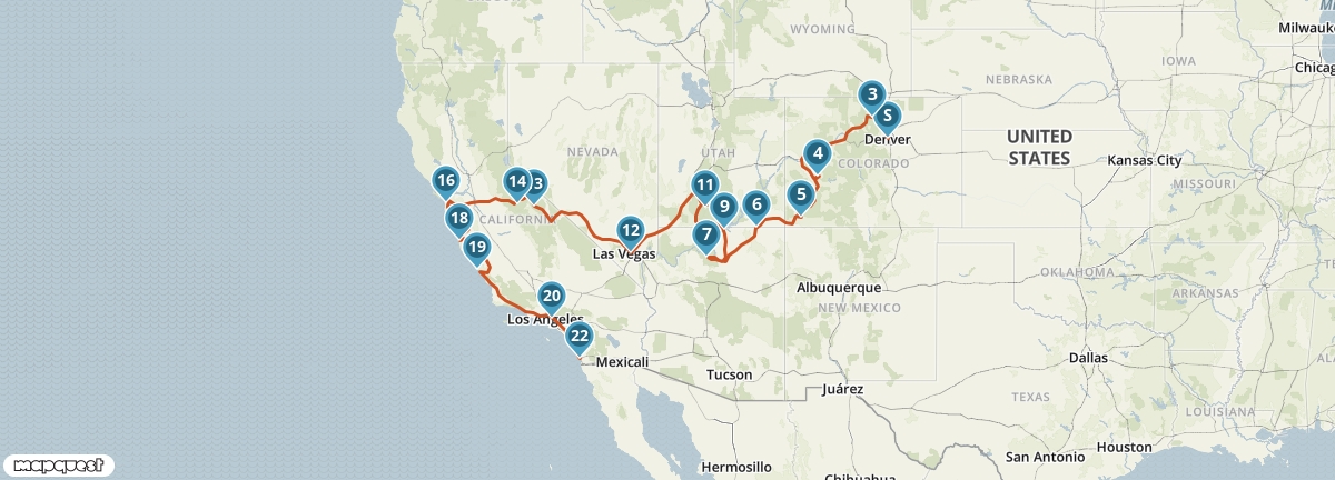 Volg het spoor van de pioniers en reis van Denver naar San Diego. Onderweg passeer je de Rocky Mountains, woestijngebieden, indianenreservaten en diverse National Parks, waaronder de Grand Canyon, Bryce Canyon, en Yosemite. Het laatste stuk van de reis voert je langs de kust van de Grote Oceaan, met tussenstops in Monterey, San Simeon en Los Angeles.