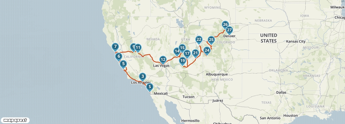 Volg het spoor van de pioniers en reis van San Diego naar Denver. Het eerste stuk van de reis voert je langs de kust van de Grote Oceaan, met tussenstops in Los Angeles, San Simeon en San Francisco. Via Yosemite National Park rijd je landinwaarts en passeer je woestijngebieden, indianenreservaten en diverse National Parks waaronder Zion, Bryce Canyon en Grand Canyon. Tenslotte steek je de Rocky Mountains over.