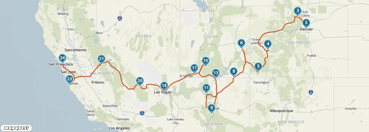 Treed in de voetsporen van de pioniers en reis van Denver naar San Francisco. Onderweg zul je je verbazen over de enorme verscheidenheid aan landschappen en de eindeloze vergezichten. Ontdek in de nationale parken Yosemite en Rocky Mountain de ongerepte natuur en neem in Mesa Verde National Park en Monument Valley een kijkje in het leven van indianen. Ook Las Vegas en de Grand Canyon ontbreken niet in deze reis.