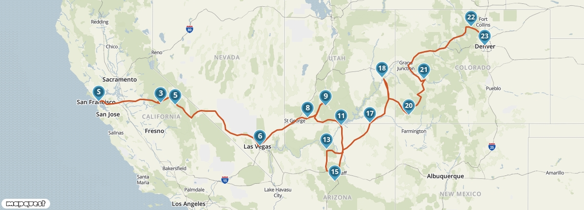 Treed in de voetsporen van de pioniers en reis van Denver naar San Francisco. Onderweg zul je je verbazen over de enorme verscheidenheid aan landschappen en de eindeloze vergezichten. Ontdek in de nationale parken Yosemite en Rocky Mountain de ongerepte natuur en neem in Mesa Verde National Park en Monument Valley een kijkje in het leven van indianen. Ook Las Vegas en de Grand Canyon ontbreken niet in deze reis.
