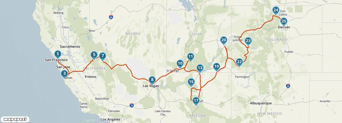 Treed in de voetsporen van de pioniers en reis van Denver naar San Francisco. Onderweg zul je je verbazen over de enorme verscheidenheid aan landschappen en de eindeloze vergezichten. Ontdek in de nationale parken Yosemite en Rocky Mountain de ongerepte natuur en neem in Mesa Verde National Park en Monument Valley een kijkje in het leven van indianen. Ook Las Vegas en de Grand Canyon ontbreken niet in deze reis.