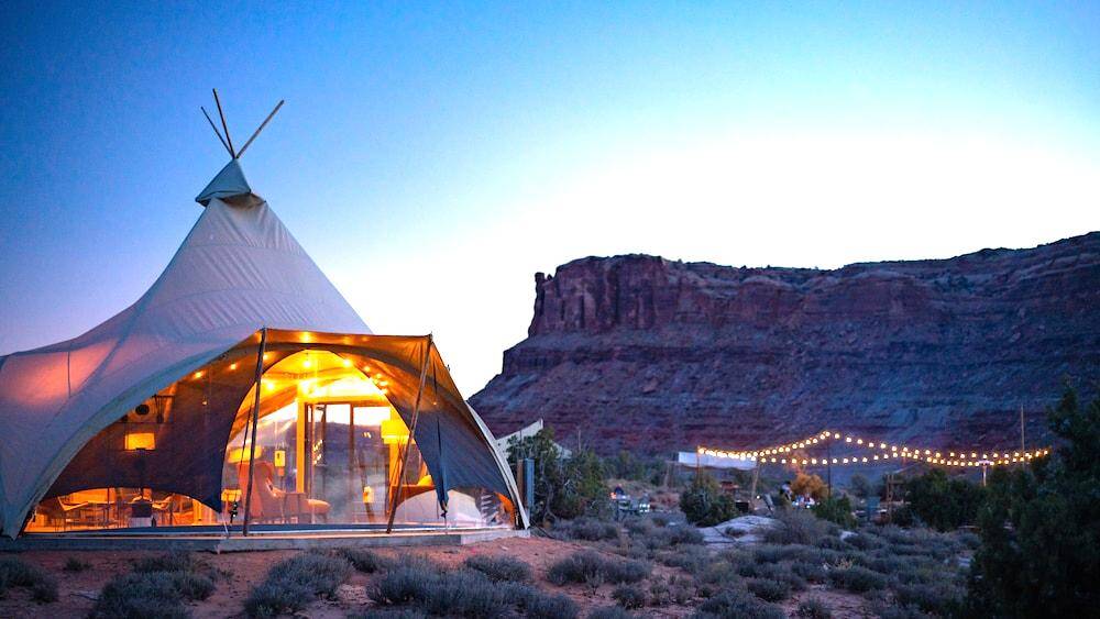 Bij Under Canvas in Moab kampeer je in luxe in een glampingtent. Er is keuze uit tenten met of zonder eigen badkamer. De glampingtenten hebben geen keukentje. Je kunt snacks en eenvoudige maaltijden kopen in het Embers Café en je kunt in de omgeving van de camping terecht voor restaurants.