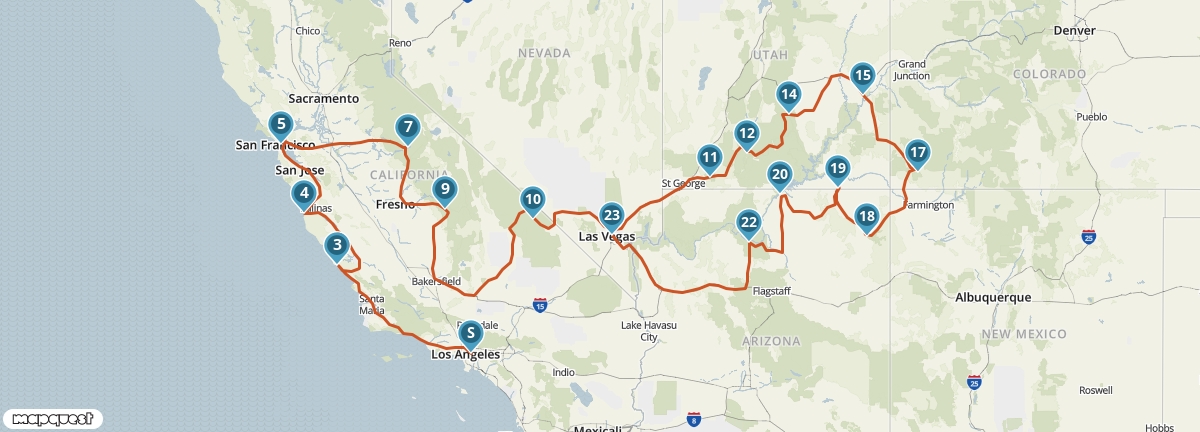 Een one-way met Los Angeles als vertrekpunt en Las Vegas als eindpunt. Je rijdt via Los Angeles langs de Pacific Coast naar San Francisco. Daarna ga je landinwaarts richting Nevada en bezoek je enkele bekende en minder bekende National Parks en indianenreservaten. Een van de hoogtepunten is de Grand Canyon. Deze reis is bedoeld voor de reiziger die liever wat minder plaatsen aandoet en zo ruim de tijd heeft om alles goed te zien. Door deze slimme one-way wordt het rijden van lange saaie stukken zo veel mogelijk beperkt en besteed je je tijd optimaal.