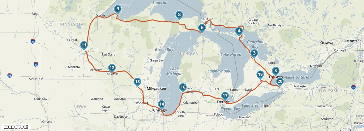 Ontdek tijdens deze rondreis de vijf grote meren bij de grens tussen Canada en de Verenigde Staten. De reis begint met de diverse stad Toronto aan Lake Ontario. Je vervolgt de weg langs Lake Erie, Lake Huron, Lake Superior en tot slot Lake Michigan. Deze afwisselende route brengt je naast de prachtige natuur van onder andere de Niagara Falls en Apostle Islands ook indrukwekkende steden zoals Detroit, Chicago en Minneapolis.