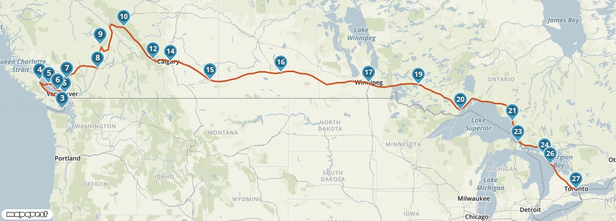 Maak een onvergetelijke reis dwars door Canada van Vancouver naar Toronto. Je reist via bergen, meren en prairies, naar de overweldigende natuur van West-Canada. Je combineert nationale parken als Banff en Jasper met torenhoge watervallen met onontdekte pareltjes als Manitoulin Island en eindigt in de bruisende stad Toronto. Een unieke route waar je het echte Canada leert kennen van de Indigenous People, maar ook Oost-Canada ervaart.