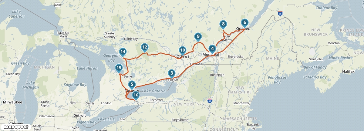Ontdek de diversiteit van Zuidoost-Canada. Vanaf Toronto rijd je via het rustige gebied van de Thousand Islands en Kingston naar de steden Montréal en Québec. Vervolgens reis je door de Laurentian Mountains naar Ottawa, de hoofdstad van Canada. Tenslotte keer je na een bezoek aan de Niagarawatervallen weer terug naar Toronto.