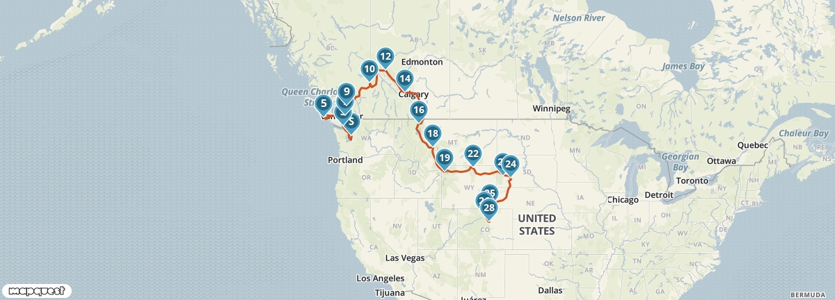 Met deze slimme autoreis van Seattle naar Denver zie veel van de Amerikaanse en Canadese Rockies zonder dat je lang in de auto zit. Je reist langs de stad Vancouver en de natuurparken Jasper en Banff met hun imposante gletjers en helderblauwe meren. Terug in Amerika bezoek je naar het vulkanische Yellowstone National Park en de presidentshoofden bij Mount Rushmore. Een afwisselende autoreis door de Rocky Mountains.