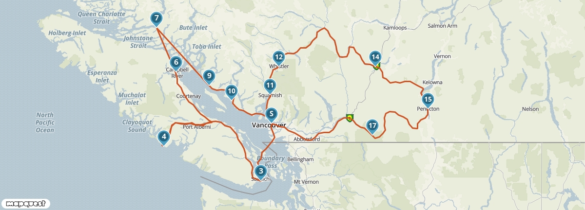 Dit traject bevat een ferry van Tsawwassen naar Swartz Bay.