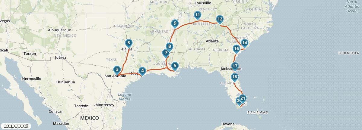 Een afwisselende autoreis door het Diepe Zuiden van de Verenigde Staten. Je start in Dallas in Texas en via de multiculturele stad New Orleans reis je naar de zonnige kust van Florida. Onderweg zie je de hoogtepunten van de Deep South, van oude plantagehuizen tot de muzieksteden Memphis en Nashville. Tussendoor kun je genieten van de natuur in het Great Smoky Mountains National Park. In Florida staan onder andere Orlando, de Everglades én Key West op het programma. Deze route is voor de reiziger die veel wil van de regio wil zien in relatief korte tijd. Uiteraard kan de route helemaal naar wens worden aangepast.